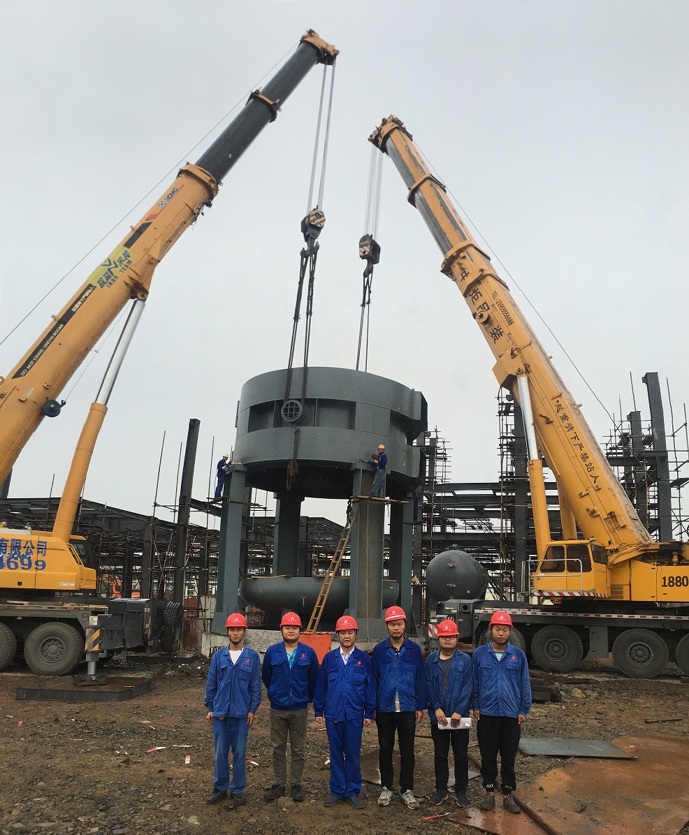 本次吊裝的反應(yīng)器中段部分重達(dá)220噸,分公司領(lǐng)導(dǎo)高度重視,吊裝前期,邀請公司總工吳繼成、總工辦主任牛守義和安全部王岳濤經(jīng)理親臨項(xiàng)目部參與設(shè)備吊裝的專題方案討論定稿工作。當(dāng)日上午,吊裝現(xiàn)場準(zhǔn)備工作緊張卻又有條不紊的進(jìn)行,項(xiàng)目經(jīng)理李子鳳向全體“參戰(zhàn)”員工進(jìn)行了安全交底,工作人員對兩臺分別為500T、350T吊車的站位及性能再次確認(rèn),現(xiàn)場機(jī)具、人員均按既定方案實(shí)施。分公司經(jīng)理史崇松、業(yè)主單位負(fù)責(zé)人、監(jiān)理全程在現(xiàn)場“督戰(zhàn)”,全體工作人員經(jīng)過四個小時的奮戰(zhàn),吊裝作業(yè)圓滿結(jié)束。