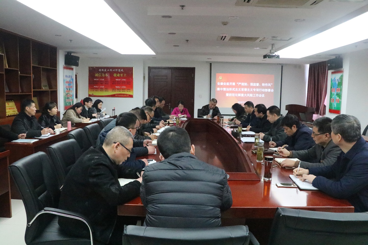3月11日上午,安徽安裝公司組織召開“嚴(yán)規(guī)矩、強(qiáng)監(jiān)督、轉(zhuǎn)作風(fēng)”集中整治形式主義官僚主義專項(xiàng)行動(dòng)部署會(huì)暨防范化解重大風(fēng)險(xiǎn)工作會(huì)議。公司黨委書記、董事長胡六中主持會(huì)議,公司領(lǐng)導(dǎo)、機(jī)關(guān)部門負(fù)責(zé)人、分公司黨政主要領(lǐng)導(dǎo)等共30余人參加會(huì)議。